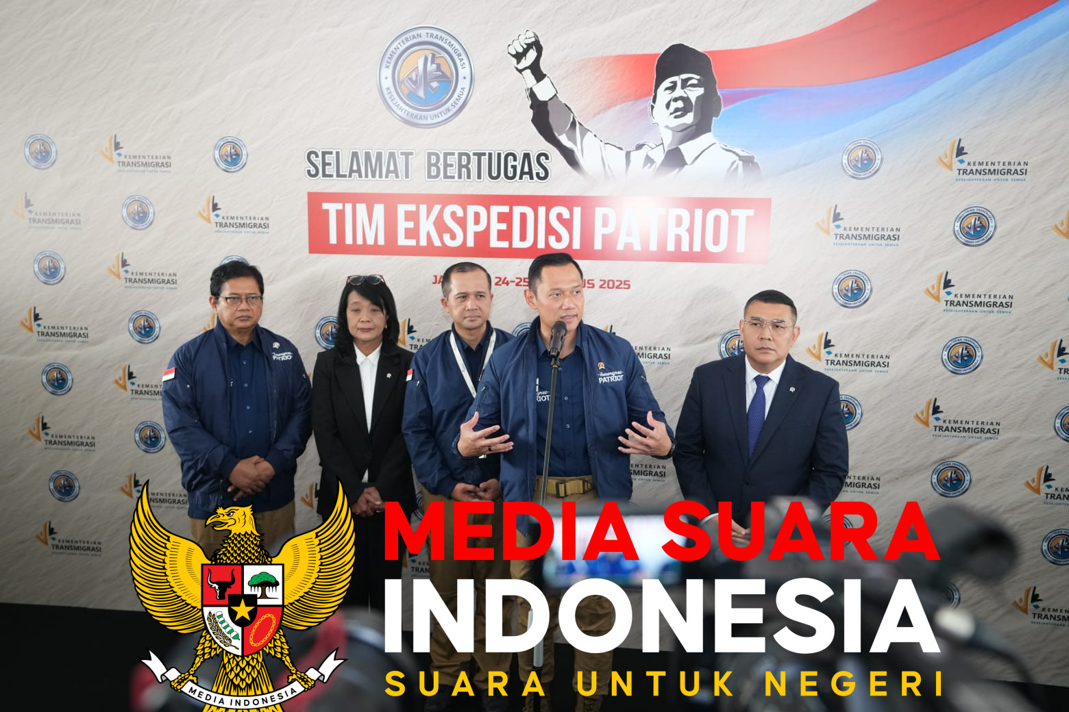 Jakarta // mediasuaraindonesia.id / Wakil Menteri Transmigrasi Viva Yoga Mauladi bersama dengan Menteri Koordinator Bidang Infrastruktur dan Pembangunan Kewilayahan Agus Harimurti Yudhoyono (AHY) dan Menteri Transmigrasi M. Ifititah Sulaiman Suryanagara, secara resmi melepas Tim Ekspedisi Patriot, Balai Kartini, Jakarta, 25/8/2025.