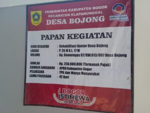 Klapanunggal, Bogor // mediasiaraindonesia.id / Pemerintas Pemerintas Desa Bojong kecamatan Klapanunggal, kabupaten Bogor, Jawa Barat, telah merealisasikan Anggaran Bantuan Keuangan Infrastruktur Desa (Bankeu) tahun anggaran 2025 dipergunakan untuk rehab kantor Desa, tahap 1 (Satu) dengan total anggaran Rp. 250.000.000 (Termasuk Pajak) ukuran bangunan, Panjang 26 meter x Lebih 17 meter, pelaksana pekerjaan oleh TPK dan warga masyarakat, target pengerjaan 42 hari.