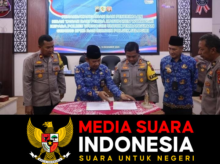 Wonogiri // mediasuaraindonesia.id / Polres Wonogiri menerima hibah tanah dari Pemerintah Kabupaten Wonogiri untuk pembangunan Gedung Satpas BPKB Polres Wonogiri dan rumah dinas Polsek Selogiri. Penandatanganan dan penyerahan hibah tanah tersebut dilaksanakan di Aula Sanika Satya Wada Polres Wonogiri, Jumat (19/12/2025).